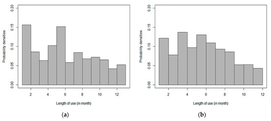 (a): Distribution of the length of use in the first stage (in months). (b): Distribution of the length of use in the second stage (in months).