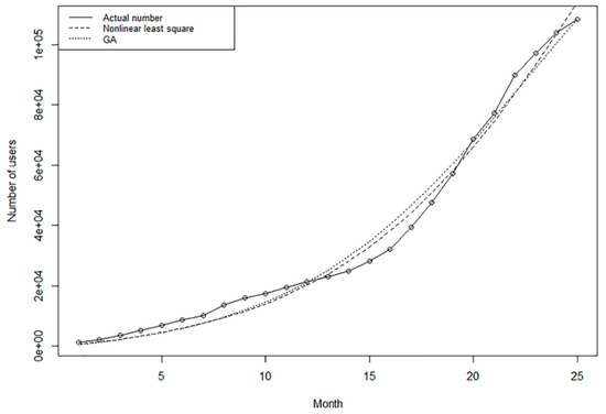 May 2016 is regarded as the starting point for technology diffusion in this paper. The users of this month are not only innovators proposed by Rogers, but also innovators in the Bass model. We took the monthly cumulative number of new users as modeling data and use nonlinear least square method and genetic algorithm (GA) respectively to estimate the parameters of the Bass model. The nonlinear least square method implements the Taylor expansion of the model and estimates the model parameters according to the minimum sum of squared errors. As a representative of the time-varying estimation method, the genetic algorithm has gradually become the main method of parameter estimation of the Bass model due to its flexibility and relatively small sample size. According to Venkatesan and Kumar [48], the GA estimation of the Bass model is better than the nonlinear least square estimation for small samples. Figure 6 shows the comparison between the fitted values of the two estimates and the actual cumulative number of new users.