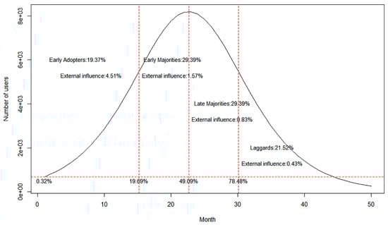 On the basis of the above Bass model parameter estimation, two important time points T1 and T2 were first calculated to be 15.2 and 30.2 respectively using Equations (5) and (6). These time points respectively differentiate the early adopters from the early majorities and the late majorities from the laggards. The proportions of the five user categories were then calculated according to Equations (7) and (8). Finally, the proportions of innovators and imitators in each category were calculated. Figure 7 shows the user segmentation.