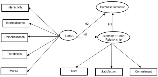 To create a “consumer–brand relationship”, the “social exchange theory” acts an important role, which comprises two-way communications. Bortree [42] explained that a higher degree of interactivities or relationships with an institution may be strongly related to the clienteles. SMM activities (SMMA) with a brand on its pages of SNS attract the recognition of users of SM and initiates a recurrent and healthy exchange with their content, which provides a long-lasting affiliation to that nurture customers. Whereas Nammir et al. [43] explained that SMMA meaningfully bestows a productive association. Moreover, SM is considered as a wider basement for the suitable system of development of the relationship, and rare studies have found the impact of SMMA on developing customer–brand attachment. Hence, the present work was engrossed to know the degree of SMMA impacts on the customer–brand relationship followed by purchase intention. The customer-brand relationship is a mediating variable between SMMA and purchase intention.