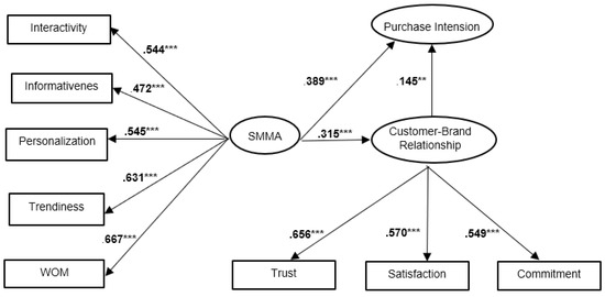 The findings of the present study observed that SMMA has a strong impact on strengthening the costumer–brand relationship with a value of 0.315 (p < 0.001) in the SM environment. This leads to the acceptance of Hypothesis 1 and it was observed that the customer-brand relationship is a mediating variable between SMMA and purchase intention. To measure the “costumer”–brand relationship, three relationship dimensions were considered, namely trust, satisfaction, and commitment. From the result dimension, trust (β = 0.656, p < 0.001) was found to have significant contribution towards relationship building, followed by satisfaction (β = 0.570, p < 0.001) and commitment (β = 0.549, p < 0.001). Meanwhile, the precise result also shows a significant influence of SMMA on the purchase intention of “costumers” with 0.389 (p < 0.001). Thus, the present study also accepts Hypothesis 2. Further, the study also measures the influence of “costumer”–brand relationships on “costumers’” purchase intentions. The results show a significant relationship, i.e., 0.204 (0.005), which leads us to accept Hypothesis 3. An outline of the hypotheses is presented in Table 6, which includes standardized as well as unstandardized estimates, t-value, and statistical significance level 3.15(α). Figure 2 is exhibits the schematic representation of the results of the “structural model”, along with significantly found standardized path coefficients level. Herein, all the structural paths are represented at significant levels (p < 0.001 and p < 0.005).