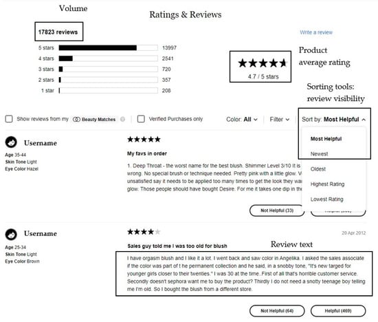 To carry out our research, we collected online consumer reviews from the product category of blush from a popular US cosmetics retailer website, which was placed in the top 50 shopping sites in the US in March 2017 according to Alexa.com. The data was obtained using web-scraping, so a robot was designed to collect the data of interest from the online retailer website. Using web-scraping, the data was stored in a structured format in Excel spreadsheets. Then, the databases were imported to R to conduct the empirical analysis. Figure 2 shows an example of the review information collected from the online retailer for each product. In addition to review-related information, other product information was gathered from the online retailer: brand name, product price, product size, product bestselling ranking, if the product was labeled as “new” and if the product was labeled as “exclusive”. Brand-related information was gathered from external sources: brand number of followers on Instagram [97], brand market share [98], and if the brand is in the category of premium brands [98]. Variables are described in Table 1.