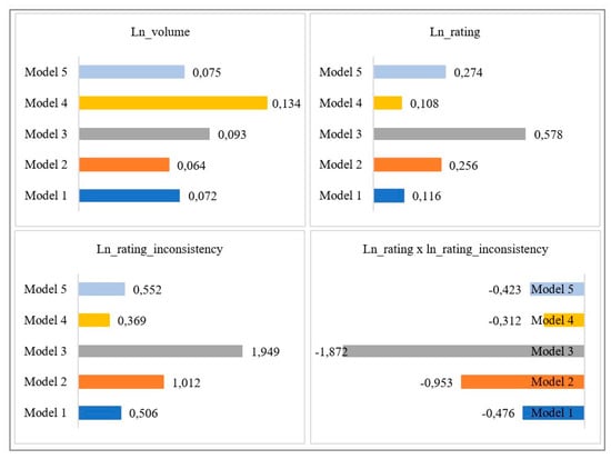 Concerning the variable l1_ln_sales_rank_inverse, it is positive and significant in every model, which means that the bestselling rank of the previous week positively impacts the bestselling rank of the current week. This confirms the dynamic behavior of the dependent variable in our model. Besides, this finding is even more relevant in our context, where consumers are likely to be influenced by a social influence effect when they are choosing between products within a category. Since consumers believe that many people have bought those products in top positions in the bestselling list, they are likely to continue buying those products, due to the social influence effect [12,59,112]. The variable ln_volume is always positive and significant, so the higher number of online reviews of a product, the more likely the product is in top positions of the bestselling rank. Coefficients for l1_ln_sales_rank_inverse and ln_volume are quite steady amongst models, so it might indicate that the effect of those variables on the sales rank does not depend much on the different cases of review visibility.