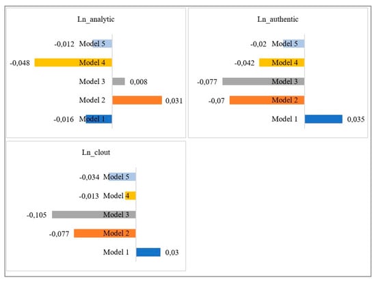 Finally, we observe that the effect of the review textual variables ln_analytic, ln_authentic, and ln_clout is significant in every model, but there are some differences in both sign and magnitude. Ln_analytic has a negative impact in case 1 and case 3, while it is positive in case 2. Having more organized, logical, and hierarchical written online reviews is positive when we are in case 2, where consumers evaluate online reviews based on the most helpful criterion. However, this feature of online reviews has a negative impact on sales when we are in case 1, when we assume that all reviews have the same visibility, and in case 3, when we assume that consumers evaluate online reviews based on the most recent criterion. Thus, we might think that consumer decision-making changes depending on the set of online reviews they view and evaluate. Ln_authentic, and ln_clout positively influence product sales in case 1, but they both have a significant and negative coefficient in the rest of the models. Therefore, if only Model 1 was evaluated, which is the one traditionally used, we might think that first, products with more personal and humble online reviews (high values in ln_authentic) and second, products with online reviews showing high reviewer confidence and leadership (high values in ln_clout) are more likely to be sold. However, we observe the opposite effect if we consider the other review visibility cases. When we assume that all reviews do not have the same probability of being viewed and consumers evaluate reviews based on either the most helpful or more recent criterion, we observe that both ln_authentic and ln_clout negatively influence product sales.