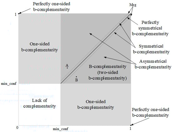 Vertical and horizontal dashed lines indicate support values, which correspond to the Min_conf value from Table 3. The continuous line indicates perfect symmetry, and the diagonal dotted line—the Mrg coefficient, which is used to determine symmetric b-complementarity—equals 5%.