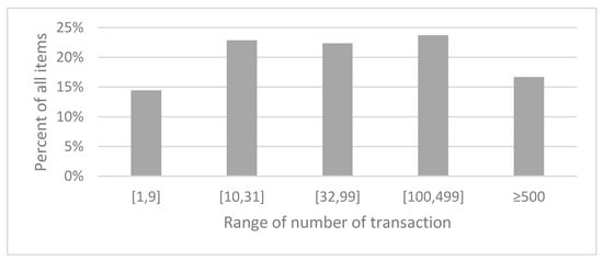 The presented concept has been verified on empirical data from “The Instacart Online Grocery Shopping Dataset 2017” [14]. The database has 49,677 items and 3,214,874 transactions. It was imported to Microsoft SQL Server 2017. The number of occurrences of each product was determined using a query that counts the number of transactions in which a given product was purchased. Table 2 shows a summary of how many items occurred in a given number of transactions (defined by ranges). The average number of transactions for the items is 653 with a standard deviation of 4792.