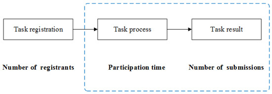 Solvers’ participation in a crowdsourcing contest can be divided into three phases: task registration, task process, and task result (see Figure 1). The research objects of this paper include solvers who have already registered for a contest. Therefore, this study mainly focuses on the impact of task rewards and duration on solvers’ participation behavior in the latter two stages.