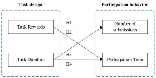 However, several other studies have reached different conclusions. For example, Rich et al. (2010) proposed that an increase in task rewards can further stimulate solvers’ motivations and efforts [16]. Liu et al. (2014) divided the participation process of crowdsourcing contests into two stages: registration and submission. By implementing a random field experiment through Taskcn.com (Taskcn.com is one of the biggest online crowdsourcing platforms in China, and was founded in 2006), they found that the higher the task rewards, the greater the registrations and submissions in both stages [17]. Meng et al. (2014) used the technology acceptance model to analyze the influence of expected income and other factors on solvers’ participation willingness and behavior in crowdsourcing contests. The results demonstrated that the expected income of solvers has a significantly positive impact on their participation willingness and behavior [18]. By using the data from Taskcn.com, Li and Hu (2017) established a two-equation model based on expectation theory, and explored the impact of task rewards and contest intensity on solvers’ participation. The results confirmed that task rewards are positively correlated with registrations and submissions [19]. Thus, there are differences in the impacts of rewards on solvers’ participation, and higher task rewards do not necessarily lead to better contest performance.