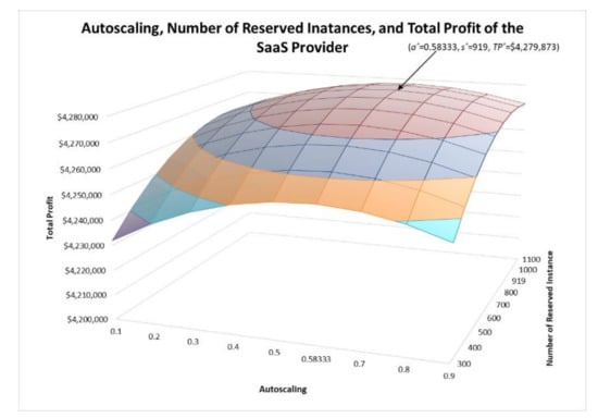 Applying the Newton Raphson method and Stackelberg game’s backward induction process, the optimal decision by the IaaS provider for the optimal reserved instance price, k*, is $246.67 which is about a 39% discount from the price of the on-demand instance. Then, the best response of the SaaS provider for the optimal number of the reserved instances, s*, is 919. The best response of the SaaS provider for the optimal autoscaling weight of the on-demand instance, a*, is 0.58333 determined by .