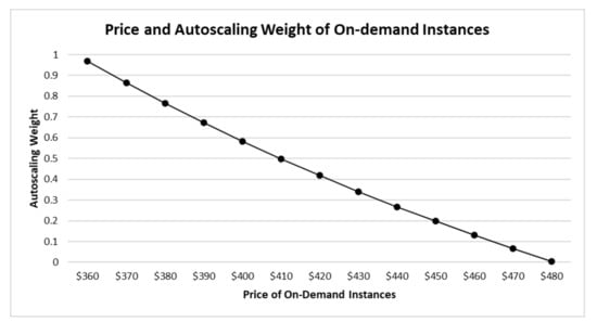 This section conducts sensitivity analyses of the Stackelberg game to understand the model’s behavior when changing the parameter values of the decision models. The parameter values in Table 2 are used in the sensitivity analyses. Figure 3 shows the impact of the price of the on-demand instance on the autoscaling weight of the on-demand instance. The result shows that the increase of the price of the on-demand instance lowers the autoscaling weight of the on-demand instance. The autoscaling weight of the on-demand instance is nearly 100% at $360 for the on-demand instance and declines to nearly 0% at $480. A further analysis reveals the upper bound price to include the on-demand instance to the autoscaling group is $480.76.