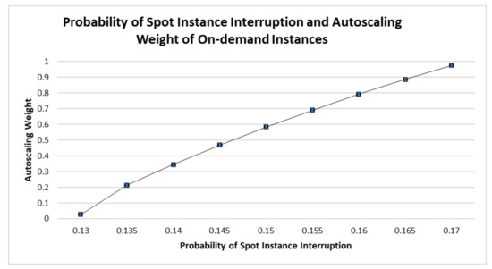 On the other hand, an increase of the probability of spot instance interruptions increases the autoscaling weight of the on-demand instance (Figure 4). The autoscaling weight of the on-demand instance goes down to nearly 0% at a 0.13 probability of a spot instance interruption and increases to nearly 100% at a probability 0.17. Further analysis reveals a lower bound probability of a spot instance interruption to include any amount of on-demand instance to the autoscaling group is 0.12766.