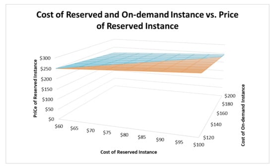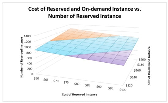 In the SaaS providers’ decision model, the number of reserved instances, s, and the autoscaling weight of the on-demand instance, a, are the decision variables. Equation (1) assumes that if the actual computing need exceeds the number of the reserved instances, the autoscaling group of the on-demand and spot instances is used to meet the shortage of the IaaS instances, . However, if the actual computing need is lower than the number of the reserve instances purchased, there will be underutilized reserved instances, , unless the idle portion is allowed to be sold to the cloud marketplace. In this model, an exponential distribution of the computing demand is assumed. However, it is possible to extend the model with other types of probabilistic distributions.
