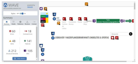 Example of the accessibility analysis of the official Lisboa Tourism website (www.visitlisboa.com) using the Wave tool. Source: own elaboration from Wave [54].