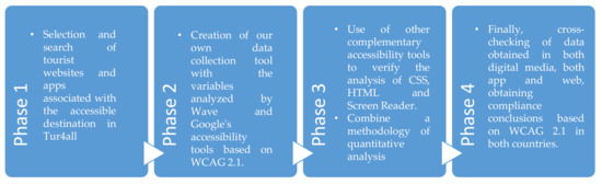 Despite the quantitative approach, it is important to ensure the soundness of a methodological design developed as a new analysis system that includes different phases of the investigation (Figure 4). Therefore, other studies that have been carried out using Wave’s and Google´s Accessibility Scanner tools are used for comparison, which increases the robustness and reliability of this study [10,13,55,56].