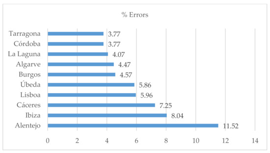 As can be seen in Figure 5, among the analyzed destinations, the location with the highest percentage of accessibility errors is in Portugal. Of the 10 destinations with the highest percentages of accessibility errors on their official tourism websites, Alentejo has the most, followed by Ibiza, Cáceres, Lisboa, Úbeda, Burgos, Algarve, La Laguna, Córdoba and Tarragona. However, it should be noted that three of the analyzed websites do not present any accessibility errors, namely, Santa Cruz de Tenerife, Mallorca and Gijón. Notably, among the results obtained, of the total of six tourism web pages analyzed from the accessible destinations of Tur4all Portugal, two of them belong to the Top 10 destinations with the most errors. In other words, 33% of the evaluated Portuguese destinations have a high percentage of errors.