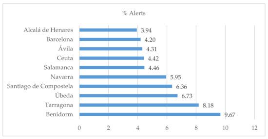 The alerts detected for the analyzed tourism web pages are shown in Figure 6. The top 10 web pages that present the most alerts all belong to Spanish destinations. Benidorm is the destination that presents the highest percentage with 9.67%, followed by Tarragona, Úbeda, Santiago de Compostela, Navarra, Salamanca, Ceuta, Ávila, Barcelona and Alcalá de Henares. In this case, it should be noted that there is no analyzed destination whose official tourism website does not present any alerts; although the percentages are small for some web pages, all of them present some type of alert that must be reviewed. The percentages of alerts for the tourism websites of Portuguese destinations are all below 3%, starting with Porto e Norte with 2.75% detected alerts and ending with Alentejo with 0.82%.