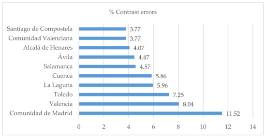 Figure 7 shows the percentage of contrast errors for the analyzed destination web pages. Spanish destinations again stand out among the 10 destinations with the highest percentages, starting with the Comunidad de Madrid with 11.52%, followed by Valencia, Toledo, La laguna, Cuenca, Salamanca, Ávila, Alcalá de Henares and the Comunidad Valenciana. In this case, some of the analyzed Portuguese destinations do not present any contrast errors: Madeira, Lisboa and Açores. The rest of the analyzed Portuguese destinations also have very small percentages of contrast errors, with only 0.20% for Porto e Norte, Algarve and Alentejo.