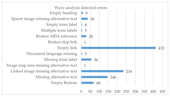 The details of several errors are presented in more detail in Figure 8. Of the analyzed sample, a total of 413 errors are related to “Empty link”, followed by “Linked image missing alternative text” and “Missing alternative text” (Figure 8). As a result, screen readers will not be able to access the content of an image, and in the case of links, there is no content to present to the user with respect to the function of the link, which is especially relevant for users who have vision problems. Additionally, if connection problems occur and the image cannot be displayed, its content is represented by means of text.