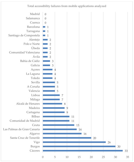 Of the total number of mobile applications analyzed (Figure 11), the accessible tourist destinations of the Tur4all program that have the greatest number of errors are the following: Cáceres, Burgos, Vigo, Santa Cruz de Tenerife, Algarve, Las Palmas de Gran Canaria, Ceuta, Comunidad de Madrid and Bilbao. The rest of the accessible destination apps analyzed by this program have fewer than 10 errors. Notably, in Portugal, only one destination’s app that was deemed accessible has more than 10 errors. Madrid, a local destination, does not present any errors in its official tourism app; however, in the case of the Comunidad de Madrid, more at the regional level of travel, the app does exceed the threshold of 10 errors.