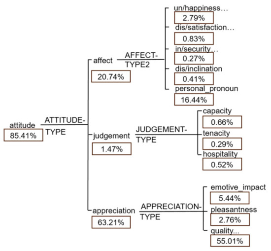 This section presents the general statistics on the use of appraisal resources. Figure 1 shows that attitude is the dominant dimension and represents 85.41% in the hotel websites’ use of appraisal resources. This result confirms that attitude plays a leading role in communication and persuasion [44] and is the most widely examined dimension in the appraisal system [45,46]. In the attitude system, appreciation ranks first with 63.21%, followed by affect (20.74%) and judgment (1.47%). The prevalence of appreciation in the system is logical because of its main concern on object evaluation, performance, and natural phenomena, all of which are closely related with hotel products. However, staff members as service providers are seldom exposed to the introduction because the subsystem judgment that is used to appraise people occupies a low percentage at 1.47%. Meanwhile, the three subcategories take up below 1%. Affect resources deal with the expression of people’s emotion and rank second in the entire attitude subsystem.