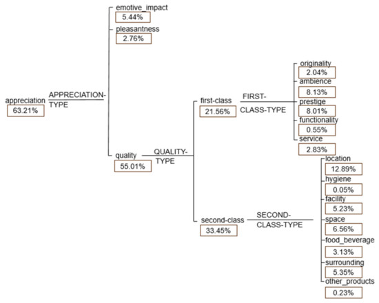 Figure 2 shows the percentage of each appreciation subcategory to further explore this most important appraisal area. Quality is the least subjective and most prevalent attribute with over 50%. The percentage of second-class quality is larger than that of first class, thereby indicating that the hotel introductions focus considerably on presenting the relatively objective hotel information. Five-star hotels favor “location”, “space”, “facility” and “surroundings”, which all occupy over 5% of the resources. For first-class quality, hotels emphasize their prestige and ambience more than their other features. This percentage is considerably higher than the other features in the entire quality attribute, except for location. A detailed discussion of the two subcategories with high percentages is provided in the succeeding section.
