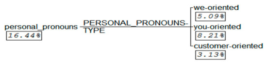 Personal pronouns are the most popular subcategory in the affect subsystem. Such a high percentage proves the correctness of inserting personal pronouns to the language evaluation study. Figure 6 demonstrates the use of personal pronouns in the corpus. The lead type is the second reference (i.e., you-oriented reference), thereby indicating that hotels highly value customers’ feelings whilst they are reading the introduction and attempt to bridge the gap to and win over these potential customers [47]. The first-person reference in the current study mainly refers to “we” rather than “I” because hotels cannot be represented by single entities, thereby prompting them to avoid using “I” in the introduction. The “we-oriented” reference comprises over 5%, thereby ranking second in this subcategory and enabling a certain confidence and authenticity to be presented [48]. However, the first-person perspective may also distance readers from a hotel because it suggests a strong subjectivity with its related statements or may isolate readers’ emotional engagement from the hotel’s products and services compared with the second-person reference.