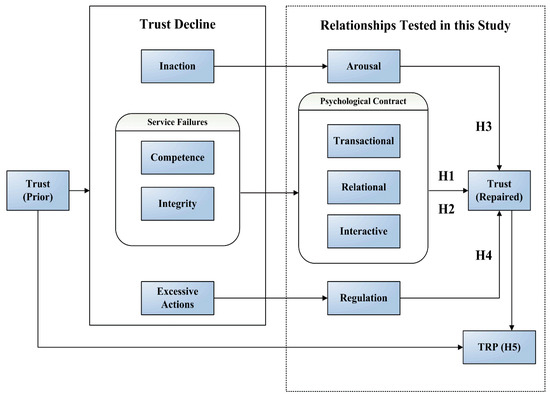 In the case of an integrity-based trust violation caused by a service failure, consumers’ repaired trust will be higher than the prior trust followed by the fulfillment of the (1) transactional, (2) relational, and (3) interactive psychological contract for compensation.