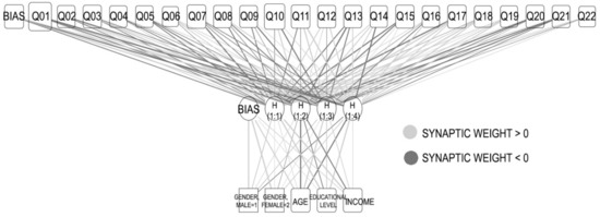 Graphically, the network obtained (Figure 1) shows the relationships between the units of the different layers with their synaptic weights, which take values greater or less than zero. Arithmetically, PEs of the input layer are first standardized and later multiplied by its respective synaptic weights. These results are modified following an activation function of hyperbolic tangent. Next, these results are multiplied by its corresponding synaptic weights, resulting in the standardized estimations of the socio-demographic characteristics of the respondents. These outputs have to invert the standardization to show extrapolate results (e.g., to educational level appears with values from 1 to 4).