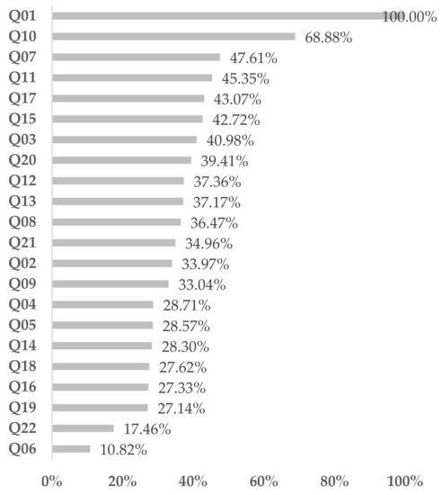 Additionally, the ANN obtained allows quantifying the relevance provided by each of the inputs in relative terms (Figure 2). It essentially highlights the planned money to spend (Q01) and the price as a deciding factor for choosing a P2P accommodation to stay in (Q10) as the most important input values for the ANN. The promotion of the local economy (Q07) and the previous users’ ratings about the host (Q11) are also noteworthy. The least relevant factors refer to the location of the accommodation (Q06) and to feeling part of the historical heritage of the city (Q22).