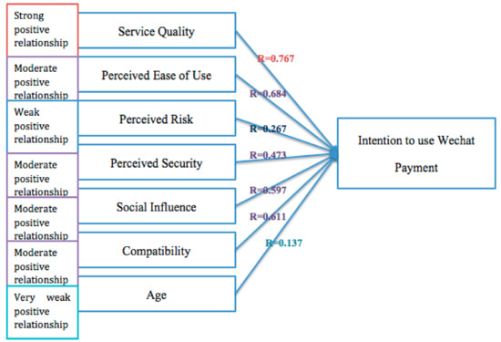 These results show that all factors were significantly correlated with intention to use WeChat Payment. However, the correlation between age and consumer intention to use was relatively weak. This result is surprising because previous studies have suggested that older people are less likely to accept innovative technology. However, the respondents’ profiles show that the study included just 16 people over 30 years old, which may have affected the results.