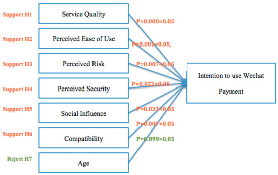 Most studies of mobile payment use age as a moderating variable and have demonstrated that age has a moderating role in the model [22,77,78]. In this study, age was used as an independent variable in the analysis with reference to the study of [61]. Surprisingly, there was no significant correlation between age and customers’ intention to use WeChat payment. This finding does not support studies that young people are more likely to use new products or technology [56,57,58]. It was believed that the younger generation has higher technology acceptance in the past. However, in the digital century and with the effect of the COVID-19 pandemic, most people regardless of their age are used to shopping in on-line stores or retailers on on-line platforms, and adopt digital payment. It is believed that age may not be the major concern when considering financial innovation and implementing digital payment in electronic businesses. We may also omit the effect of age when improving the mobile payment platform. However, to further increase the competitiveness of the mobile payment platform, the operators or other interested parties need to develop competitive strategies based on the researched factors.