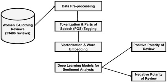 Data from the Kaggle repository (https://www.kaggle.com/nicapotato/womens-ecommerce-clothing-reviews, accessed on 15 March 2021) was used in this research [], which is an open-source platform of data science that helps to explore new dimensions of artificial intelligence by providing benchmark datasets. Kaggle allows the researchers to find and publish datasets, and explore and build new models in collaboration with other data scientists to provide solutions to data-related problems. Data used were related to women e-clothing reviews, and unstructured in nature. The dataset consisted of 23,486 reviews, along with ten feature variables: clothing ID, age, title, review text, rating, recommendation, positive feedback count, division name, department name, and class name. To maintain privacy, the company name in the text reviews was replaced by the word “Organization”.