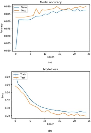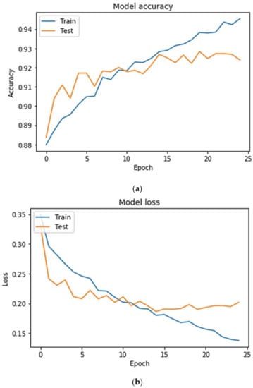 The CNN model was trained for 25 epochs together with a batch size of 50. The batch size and epoch are control hyperparameters, which are associated with the optimization. The number of epochs defines the number of times the entire training dataset passed through the learning algorithm, which means that each data sample obtains an opportunity to update the internal model parameters. The dataset is grouped into the batches. Each batch contains a batch size. The impact of batch size is typically computational as it usually affects the training time and not so much the test performance. The smaller batch size is used for both configurations as it results in quick convergence and more stability, which can be observed in Figure 2 and Figure 3. The graphs are plotted to visualize the model’s training accuracy and loss trends, as can be seen in Figure 2 and Figure 3. In Figure 2a, an interesting trend is observed—the accuracy curve rises as the number of epochs increases. Initially the validation accuracy value is less, but the validation accuracy curve is higher than the training curve. In Figure 2b, the validation loss curve, which is generally downward, shows that the validation loss or error decrease as the model improves in terms of learning. Similarly, in Figure 3a, the rising trend of the accuracy curve is observed, and Figure 3b shows degradation of model loss or error.