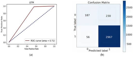 (a) AUROC curve of LSTM-based model and (b) the confusion matrix of the LSTM-based model.
