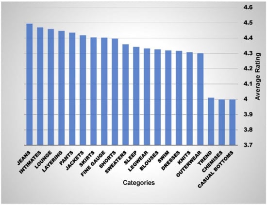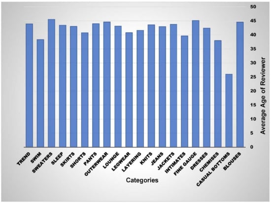 Organizations vigorously observe performance of ”company’s offerings” in the market to make efficient decisions. Cross comparisons enable organizations to compare data classes relative to feature variables. In order to visualize the traits of the dataset, the relationship between four feature class variables was determined. Figure 6 represents comparison of product categories on the basis of average ratings received from online reviewers. Three product categories—trend, chemises, and bottoms—received below average ratings. Nine product categories—knits, formal dresses, swim suits, blouses, leg wear, sleep wear, sweaters, and shorts—received moderate ratings ranging from 4.3 to 4.4. The remaining products—fine gauges, skirts, jackets, pants, layering wears, lounge wears, intimates, and jeans—are top performing categories of the organization. Similarly, Figure 7 represents average age of the users related to each product category. As shown in Figure 7, it can be concluded that mature users, with ages ranging from 35 to 45 years, are the target segment of the organization. Causal bottoms is the only product category which targets young consumers, i.e., those having an average age of 25 years.