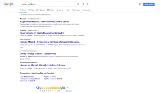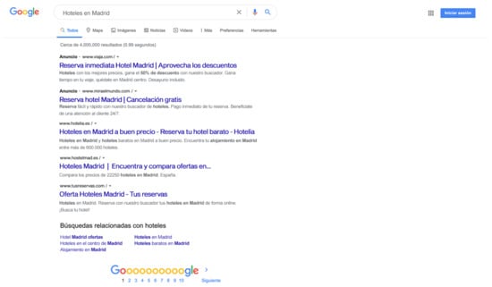 First, the Google Ads tool was used to search for the keywords most used when searching for hotels. The most frequent were then chosen for later use in the design of the ad messages. When designing the messages of the organic results, real search results were imitated. Next, because the experimental design was based on testing the influence of the regulatory fit on the persuasiveness of the ads, in two of the three experimental conditions, the ads were oriented according to the promotion (PRO) or prevention (PRE) fit. In the third condition, the ads had no orientation at all (in Spanish: ‘anuncio sin orientación’; ASO). In the case of the organic results, messages were designed with neutral messages to avoid influencing the attention and behavior of the subjects. The experimental conditions are shown in Figure 1, Figure 2 and Figure 3.