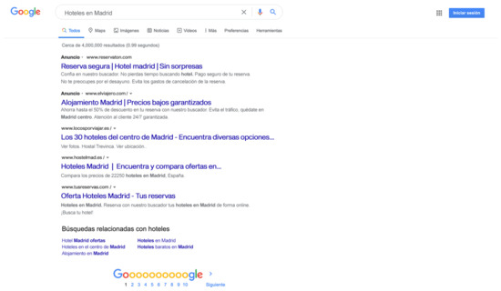 - The first screen to appear contained the instructions and could be changed to the next screen by clicking on the search keywords “Hotels in Madrid”. The most general search keywords were chosen to avoid creating confusion and to simplify the task.