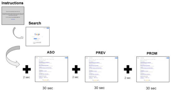 - The second screen showed the Google search bar. After clicking on the “Search” button, the first two-second baseline appeared. The following screens corresponded to the ASO, PRO, and PRE conditions, which were shown at random with a baseline between each. For each screen, the subject was asked to navigate around the page and click on the desired result, but this did not lead to another screen until a period of 30 s had passed. This was applied to collect more metrics and to be able to control the duration of the stimulus for all participants. The order in which the stimuli were displayed differed between participants.