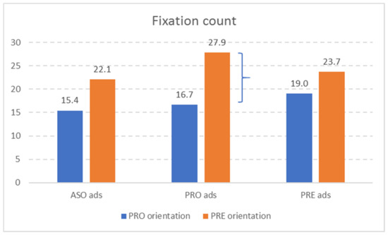 Greater visual attention, measured in terms of FC (see Figure 8), was directed towards the set of PRO ads by subjects with the prevention orientation than among the PRO-oriented ones (F = 7.277; df1; df2 = 42; p = 0.010), a result that was opposite to that expected. The Kruskal–Wallis test showed that the difference in mean according to the approach for the set of PRO ads had a 5% significance level (Kruskal–Wallis’ H =5.674; p = 0.017).
