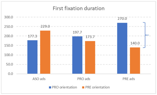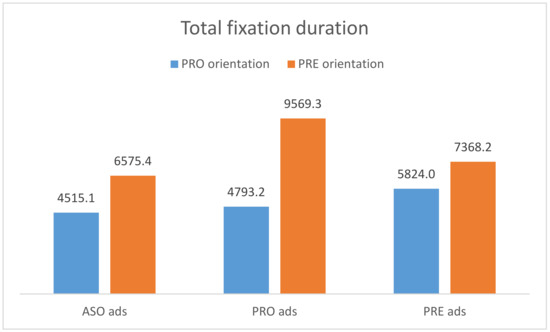 In contrast to the previous case, the set of PRE ads had a mean FFD that was significantly higher (see Figure 9) than the PRO-oriented ones (F = 12.565; df1; df2 = 41; p = 0.001). A Kruskal–Wallis test showed a difference in means with a 1% significance level (Kruskal–Wallis’ H = 13.448; p = 0.000). In addition, a significant difference was observed in the FFD for the ASO condition (F = 4.261; df1; df2 = 38; p = 0.046), which was longer than for prevention-oriented individuals. However, this mean difference was not confirmed by a non-parametric test.