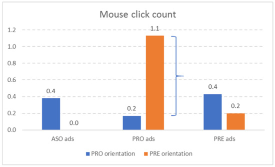 An ANOVA was then carried out to check whether the regulatory fit was met for the clicking behavior. The regulatory fit factor was found to influence the number of clicks for the PRO ad set, with a 5% significance level (F = 12.385; df1; df2 = 42; p = 0.001), and it can therefore be stated that there were differences in the click behavior of the subjects according to their orientation. A Kruskal–Wallis test confirmed the difference in means according to the fit for the PRO condition (Kruskal–Wallis’ H = 11.896; p = 0.001). In particular, the average number of clicks by the PRE-oriented subjects on the PRO ad set was higher than for the PRE-oriented subjects, as expected (see Figure 12).
