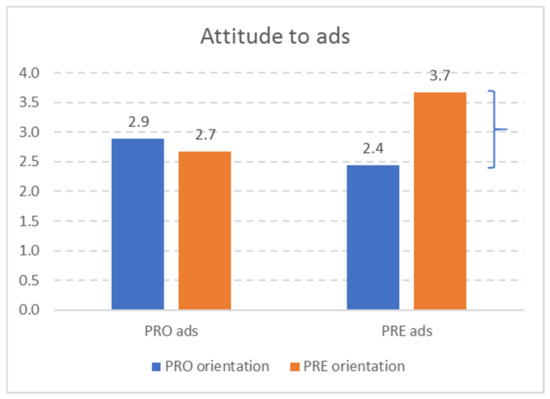 For this analysis, a t-test for mean differences was performed, in which the average score for the classic attitude item (pleasant vs. unpleasant) for the PRO and PRE ad sets was used as the dependent variable and the regulatory fit (PRO and PRE orientation) as the independent variable. No significant differences were observed in the subjects’ attitudes based on their regulatory fit in the case of the PRO ads (t = 0.356; df = 13; p = 0.727), but the regulatory fit was met for the PRE ads with a 10% significance level (t = −2.853; df = 13; p = 0.014). To support these results, a non-parametric Mann–Whitney’s U test was carried out, which showed that there were no significant differences in the case of PRO ads (Z = −0.426; p = 0.670), but there were significant differences for the PRE ads (Z = −2.252; p = 0.024, see Figure 13).