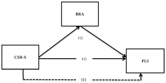 Proposed research model: This figure is based on the authors’ conception that contains three variables. There is the independent variable, CSR-S at the extreme left side, and at the extreme right side of the figure, there is the dependent variable PUI. In the middle of the figure, there is the mediating variable BRA.