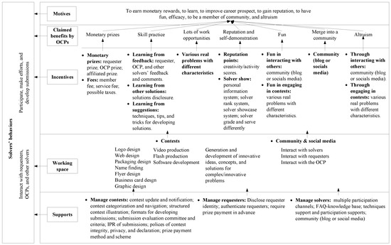 It is found that the aforementioned incentives are closely tied to contests and communities that act as the working space. In other words, solvers conduct any action and gain any benefit only through participating in published contests or acting in the community. For example, participating and winning in a contest is the dominant way for solvers to practice skills, earn money, or increase reputation. As well, solvers could gain some skills and have fun interacting with requesters, OCPs, and other solvers in the community. In our selected OCPs, four major kinds of contests, that is, product design (graphic design, logo design, web design), video production, software development, generation and development of innovative ideas, concepts, solutions for complex/innovative problems were launched for solvers. A community, sometimes specialized as a blog, forum, or social media-based community, was developed by most OCPs for solvers to acquire the latest news, contests, notifications, and other information and more importantly to interact with others. The community is very helpful for increasing solvers’ sense of belonging and feeling of fun [66,67]. In a word, the working space is a foundation that connects incentives and supports. Design of incentives and supports are wrapped around the working space.