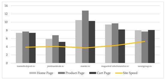 Emotional mitigation by optimizing the touchpoints load speed is the main opportunity that retailers can take advantage of because the waiting loading time is a real challenge for them. The authors’ first hypothesis has been confirmed and the online stores that present a poor rating do not show a notable performance in terms of speed in the last month. According to the results, the attention that they pay to the evolution of performance tends to zero, even if they need to implement enhancements is imperative. In this case, the characteristics of the retailers’ websites do not meet the needs of consumers and do not facilitate the search, highlighting the negative influence of the in-between non-interaction touchpoints on the decision-making process []. The authors expected the shopping cart page to be treated with high interest by retailers, given that users’ sensitivity to loading time, especially in the pre-checkout phase. In contrast, all studied cases present a cart load speed greater than 2.5 s, in some cases reaching a doubled load speed when users are moving forward to the product page or the shopping cart page, reaching values extremely high (up to 19.8 s).