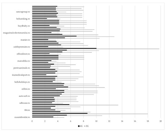 Additionally, the 4G network presents a page load speed that increases as the consumer approaches the checkout. Compared to the 3G network, the situation is changed in the case of helloholidays.ro, which in the 4G network, maintains the speed for the home page and the product page at 3.6 s, increasing the speed of the shopping cart to 3.9 s. On the other hand, officedirect.ro shows a very big difference when switching from the product page (5.4 s) to the shopping cart (10 s), even if this time the values are lower. The generated effect on users is negative. Within this network some retailers have a changing loading speed, oscillating between increases and decreases in loading time. Seven of them present a changing speed generated by the increment of the number of seconds when switching from the home page to the product page, followed by a decrease of the shopping cart page’s load speed.