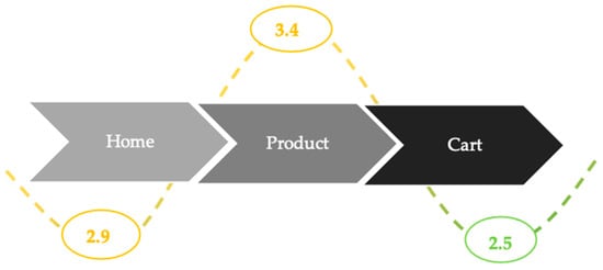 This is maintained only in the case of two, marosbike.ro and buy4baby.ro. The ideal case in which it decreases as the user approaches the checkout is for a single online store (cafelepremiate.ro. However, every touchpoint of this retailer presents a page speed that needs improvements because of its high values. Therefore, a good example can be described in the situation illustrated in Figure 4. There, the process of the user who accesses the www.pentruanimale.ro’s website [] and reaches the shopping cart page is presented. The shopping cart touchpoint has a good rating compared to previous touchpoints, presenting the recommended loading speed during the customer journey.