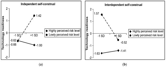 Technology readiness: (a) technology readiness toward the mobile app as a function of participants’ independent self-construal and perceived risk; (b) technology readiness toward the mobile app as a function of participants’ interdependent self-construal and perceived risk; SD is standard deviation.