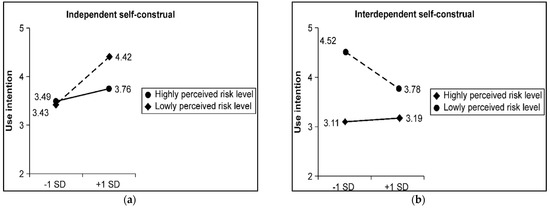 We conducted a spotlight analysis at one standard deviation below and above the mean of the independent self-index (M = 4.73) while holding the interdependent self-index (M = 4.17) constant at its mean. The result showed that participants with a low level of independent self-construal did not distinguish between the high-risk and low risk mobile apps (β = 0.016, p > 0.1), whereas participants with a high level of independent self-construal perceived use intention more positively toward the low-risk mobile app than the high-risk mobile app (β = −0.319, p < 0.05) (see Figure 2a).