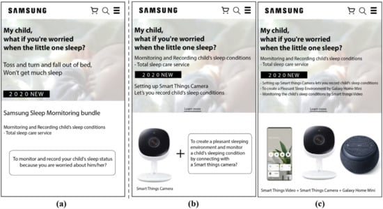 Procedure: Participants started the test by reading a shopping scenario that they were purchasing products for their baby, who had not gotten sufficient sleep lately. Participants were then asked to imagine that they found a Samsung Electronics’ sleep monitoring product package on the company’s official mobile commerce site. To evaluate the effect of information seeking under uncertainty, we prepared in total three separate mobile pages. The first page (a) included only basic information about HP including its brand name, its name with a short description and a catchphrase. The second page (b) included an image of a single key product of the HP with a verbal description of its benefits. The third page (c) included an image of the full three products (see Figure 1). In the “before information seeking” condition, participants were provided with mobile page (a) only. In the “after information seeking” condition, participants were provided with two mobile pages, (b) and (c). Note that when designing mobile pages, we divided product information into three pages because the amount of information consumers were able to cognitively process was limited due to the small screen size []. Because it was important in the “after information seeking condition” that people process information comprehensively and not ignore it, we provided two separately prepared mobile pages, (b) and (c), sequentially.
